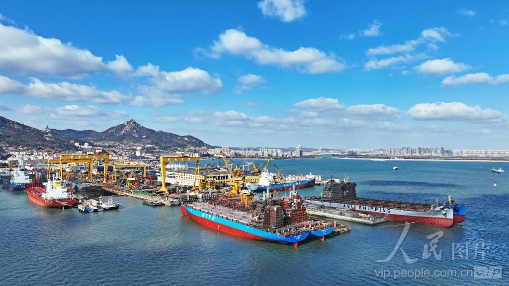 2024年1月24日,在山东省荣成市石岛管理区黄海造船有限公司船坞内,集装箱船、多用途重吊船、冷藏运输船等各类大型船舶抓紧建造中。 据了解,目前,荣成各大修造船企业到处一派繁忙、有序的生产景象,修船企业依靠雄厚的技术实力吸引了俄罗斯、斯里兰卡、埃及、意大利、希腊等20多个国家和地区的大型船舶靠泊维修。造船企业目前手持集装箱船、多用途重吊船、冷藏运输船、天然气(LNG)运输船等各类高附加值船舶订单超过70艘,所有船台持续保持满负荷生产状态,出口占比已接近总产量七成,交付安排将一直延续至2026年。 近年来,荣成市着眼于推动船舶与海工装备产业高质量发展,加大产品结构优化升级和优质海工资源盘活力度,强化产业链合作,带动修造船企进行技术创新,增强市场竞争能力,修造船行业在逆势中发展强劲。