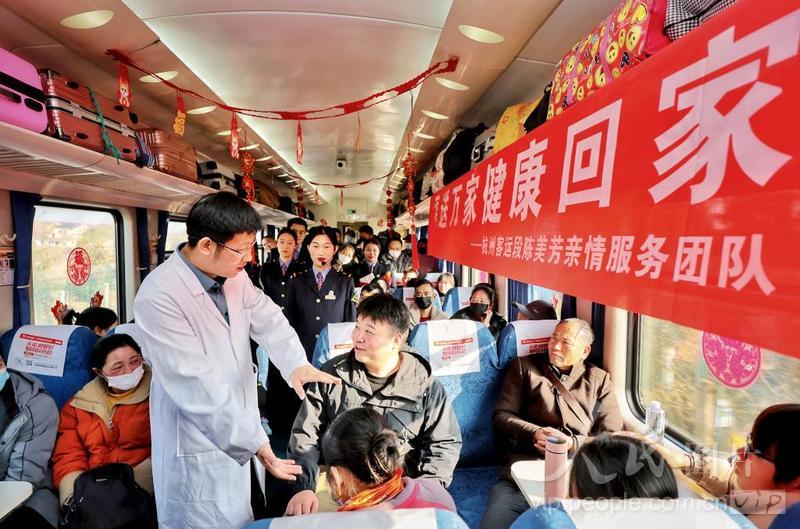 2024年1月28日,宁波开往广州白云的K212次列车上,骨科医生徐文斌为旅客免费“义诊”,答疑解惑,分享健康的生活习惯。
