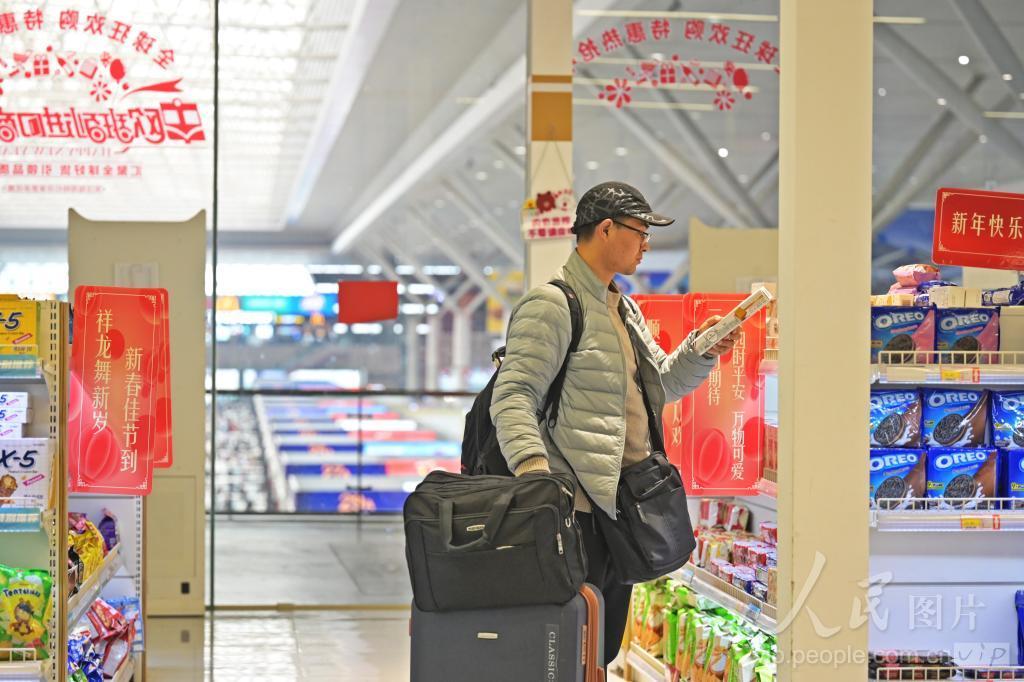 2024年2月6日,河南郑州东站候车大厅的中欧班列进口商品超市内,旅客在候车间隙挑选中欧班列进口商品。