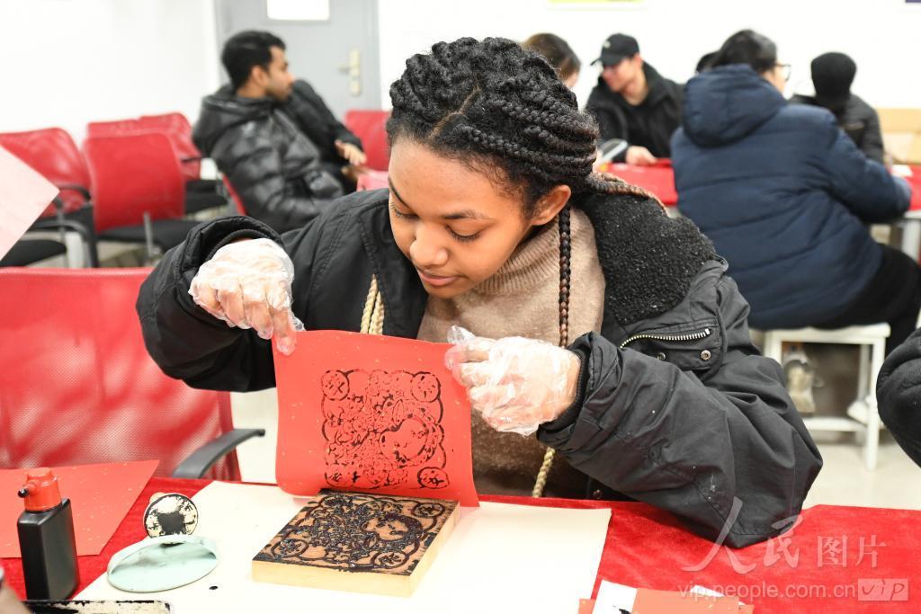 2024年2月7日,江苏理工学院的留学生正在体验雕版印刷画。
