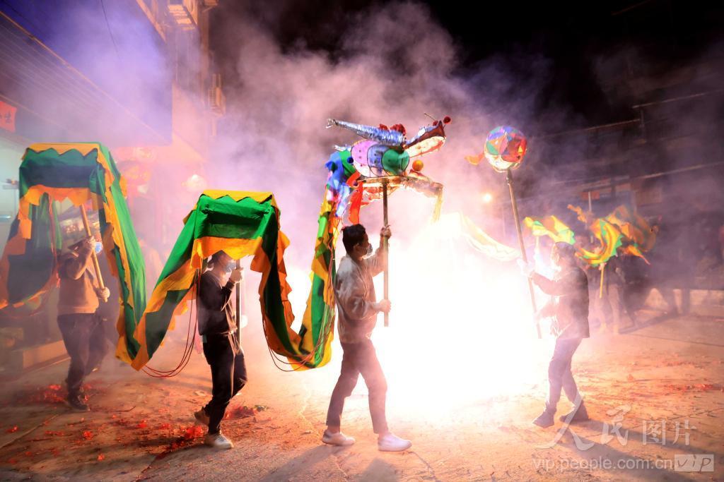 2月12日晚,人们在广西柳州市融安县浮石镇舞动炮龙,庆祝新春佳节。