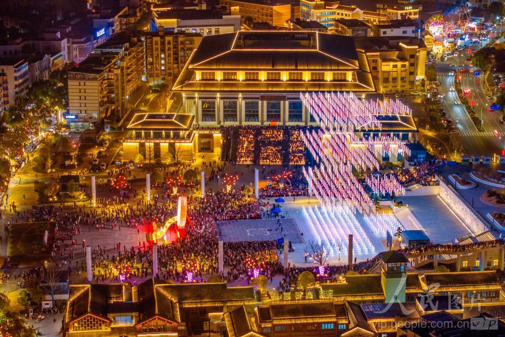 2024年2月12日,浙江省绍兴市新昌县康乐广场前,无人机表演吸引不少人驻足观看。