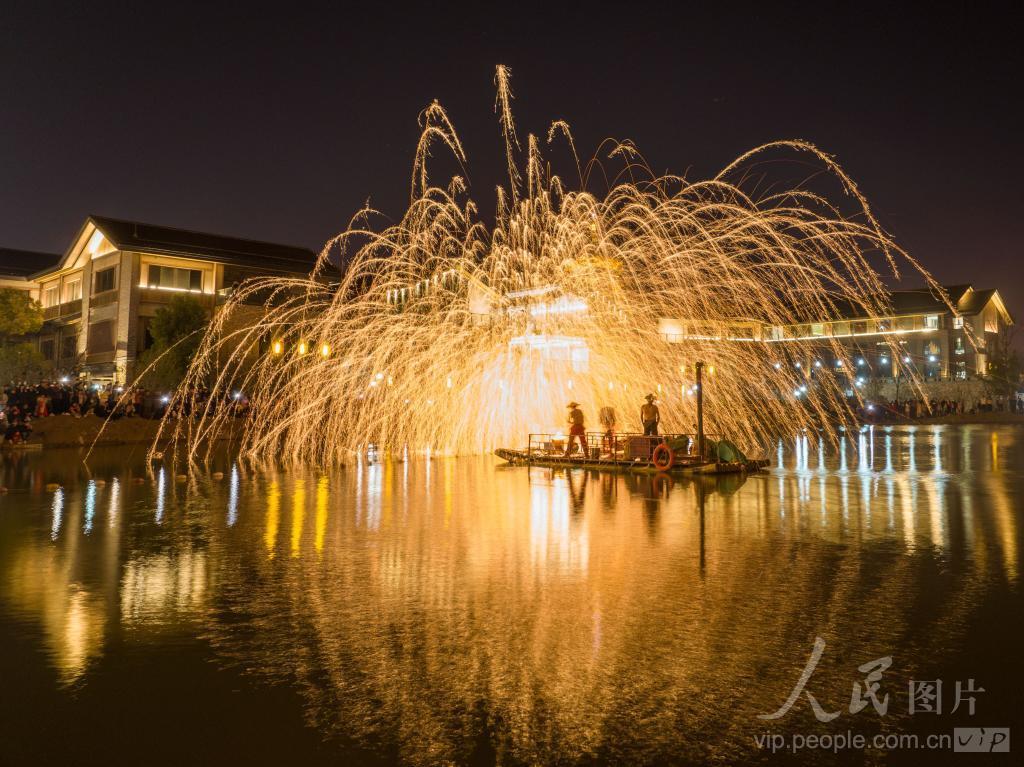 2024年2月12日晚,安徽省合肥市肥东县撮街凤凰湖上演“非遗打铁花庆新春”表演活动,夜空中的璀璨铁花营造出浓浓的春节氛围,吸引众多市民欣赏。