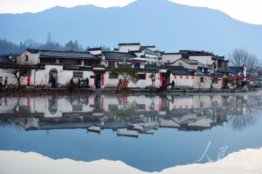 2024年2月12日,众多游人在安徽省黄山市黟县宏村游览观光。
