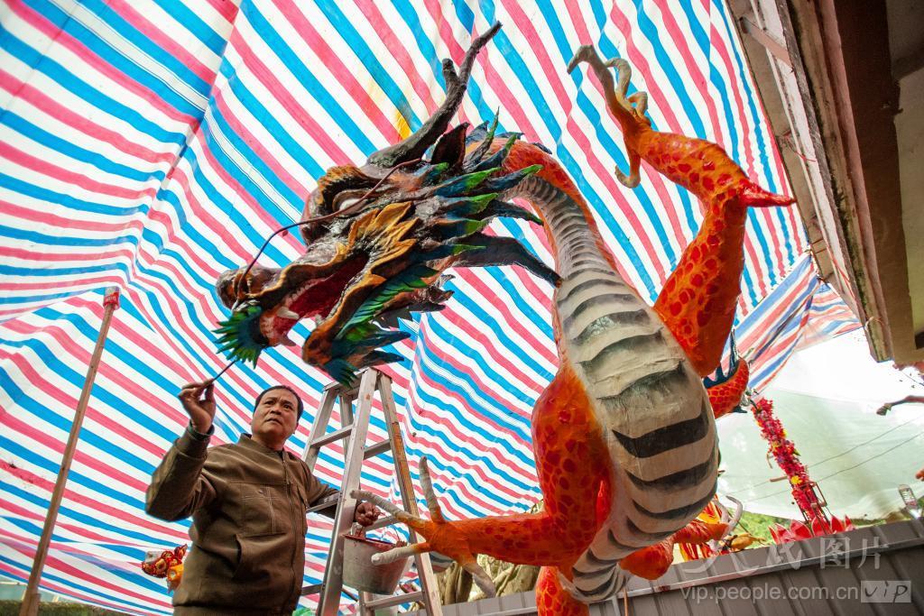 2024年2月13日,在广西壮族自治区靖西市新靖镇中山社区,民间艺人在装扮“祥龙贺岁”台阁。