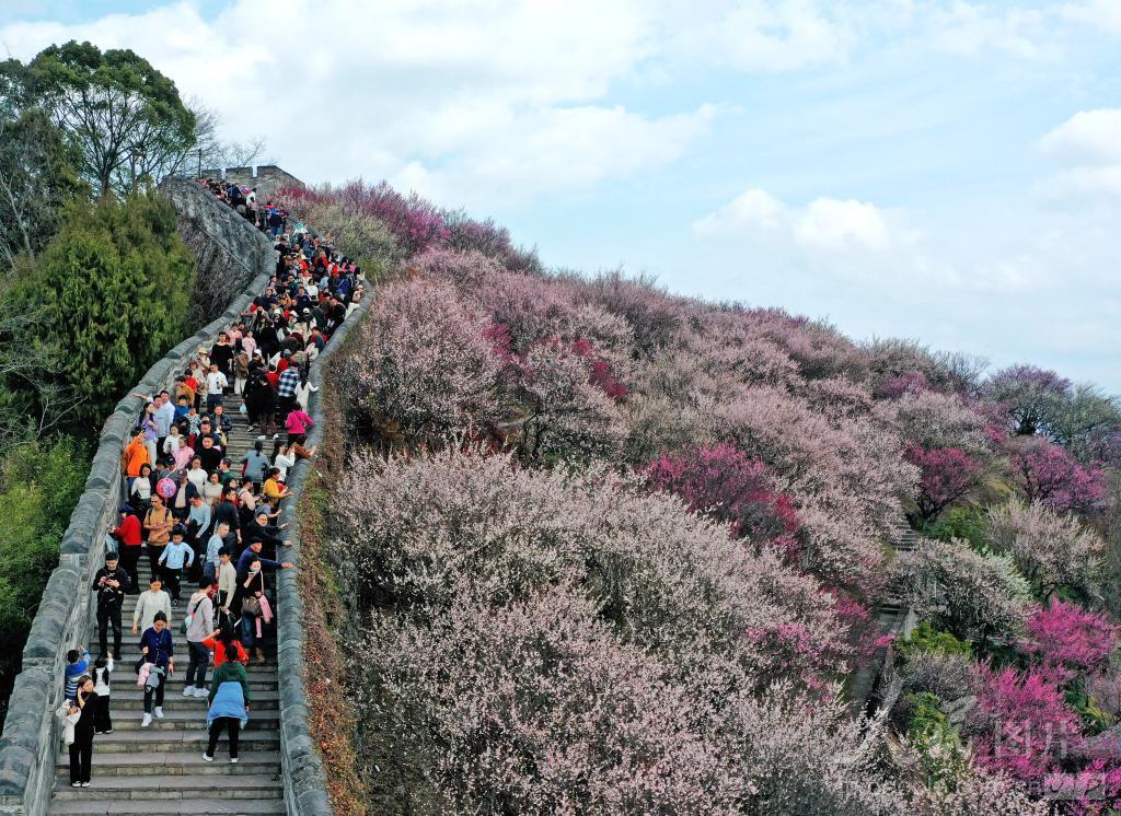 2024年2月13日,浙江省临海市,台州府城梅花盛开,吸引游客纷至沓来。