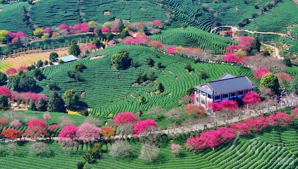 春节假期,福建省龙岩市漳平市永福镇,红色的樱花与绿色的茶园交相辉映,吸引了众多游客纷至沓来。