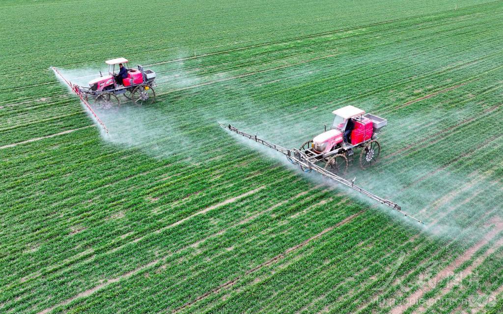 2024年2月18日,在安徽省亳州市利辛县纪王场乡孙老家村麦田,农民驾驶自走式高杆喷雾机对小麦进行喷药作业。