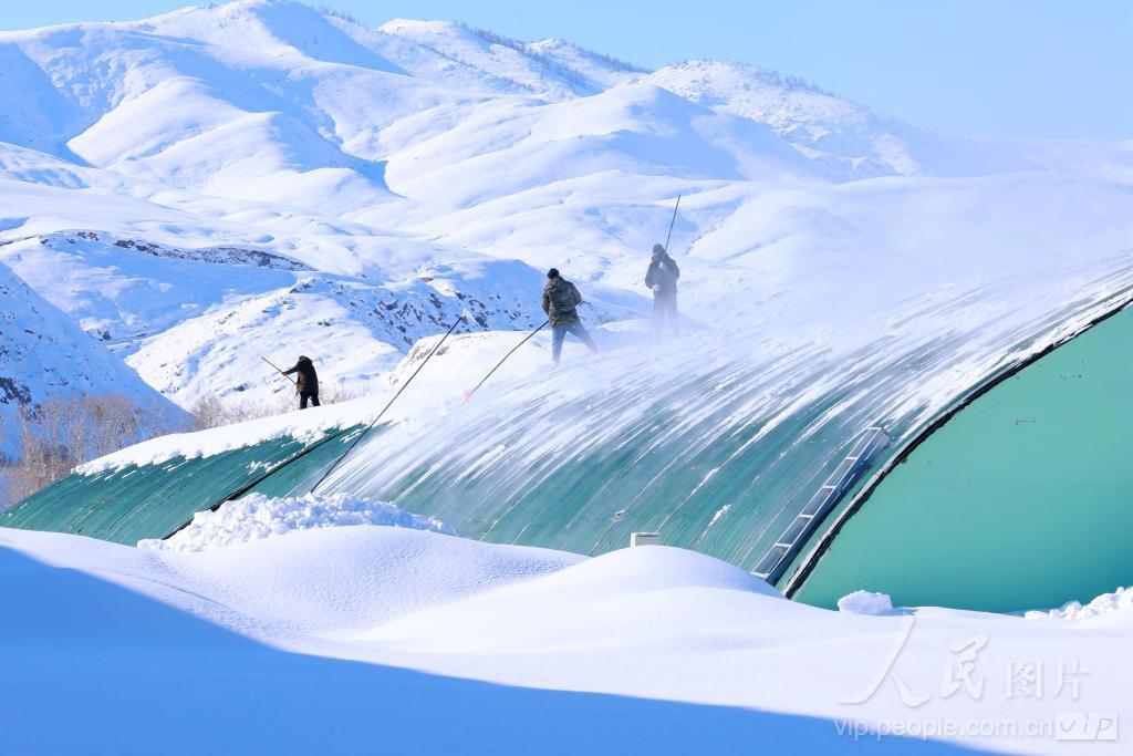 2024年2月18日,位于阿勒泰市拉斯特乡的新疆阿勒泰现代农业博览园里,园工在清理蔬菜大棚上的积雪。