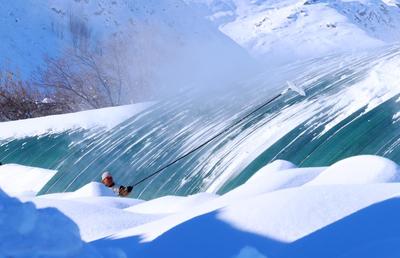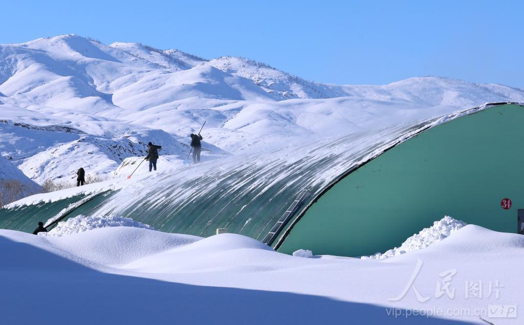 2024年2月18日,位于阿勒泰市拉斯特乡的新疆阿勒泰现代农业博览园里,园工在清理蔬菜大棚上的积雪。