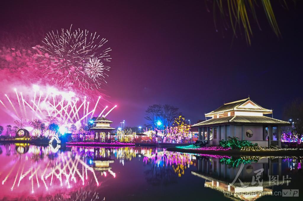 2024年2月17日晚,广西北海市合浦县方华欢乐世界景区张灯结彩,烟花秀表演。