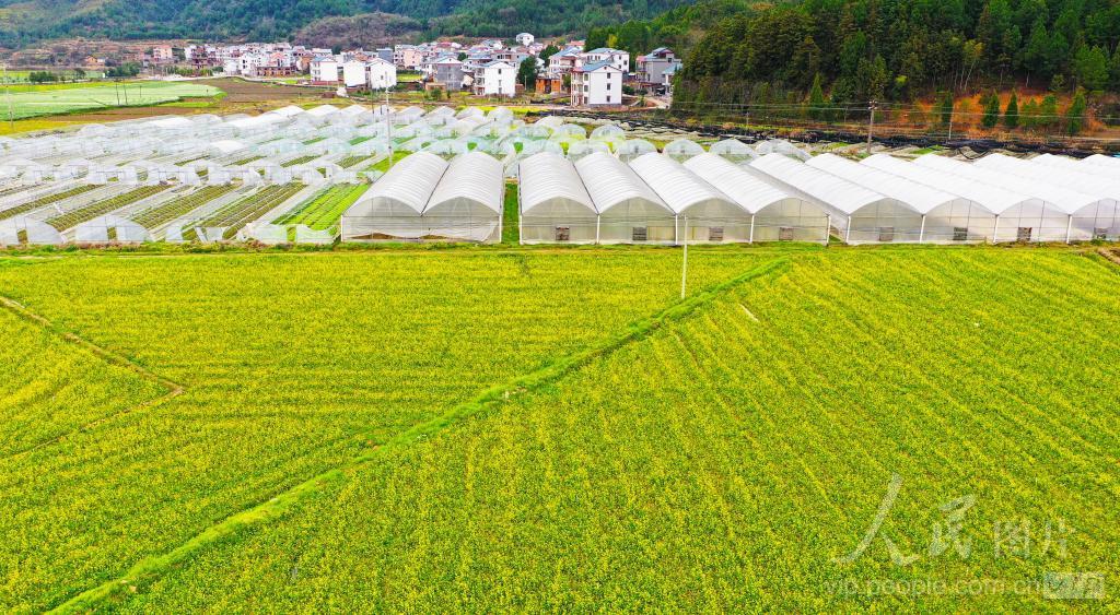 2024年2月21日,湖南省永州市新田县东升村数百亩白菜花迎春绽放,金黄色的白菜花与青山、河流、道路、民居相互映衬,构成一幅春意盎然的田园画卷。