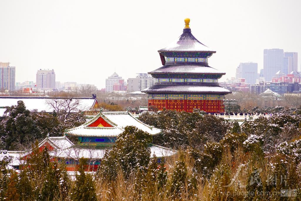 2024年2月21日,北京,龙年首场降雪过后京城被白雪覆盖,中轴线上的永定门、天坛祈年殿、故宫建筑群、寿皇殿、钟鼓楼等古建筑美景如画。