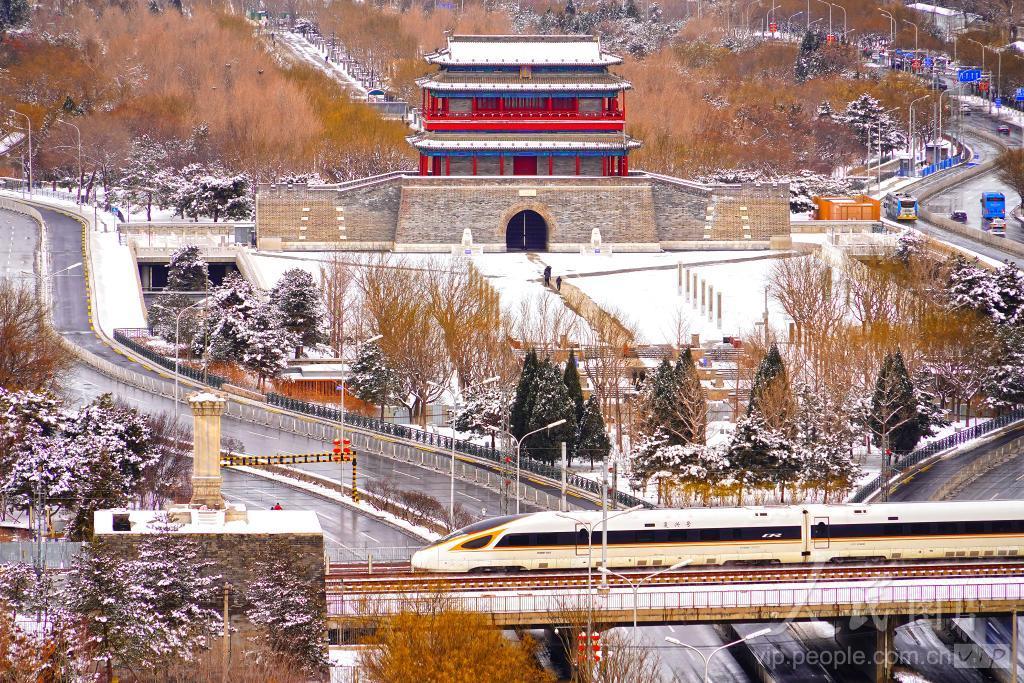 2024年2月21日,北京,龙年首场降雪过后京城被白雪覆盖,中轴线上的永定门风景如画,一辆高铁动车驶过。