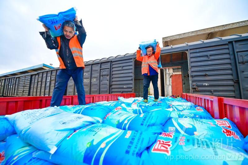 2024年2月23日,在中国铁路南昌局集团有限公司赣州车务段赣州国际港站,工作人员在装卸化肥。 时值春耕备耕时节,中国铁路南昌局集团有限公司赣州车务段充分发挥运力集中调度优势,开辟化肥等春耕备耕物资“绿色通道”,通过车辆运力周转、增加作业频次、快速抢装抢卸等措施,以高效运输保障春耕生产,确保不误农时。