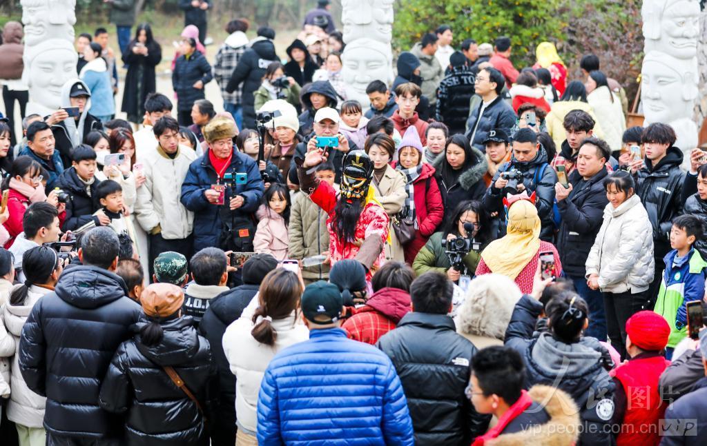 2024年2月25日,江西省抚州市南丰县三溪乡石邮村村民正在表演傩舞,吸引了全国各地的游客、摄影爱好者和附近村民前来观看。