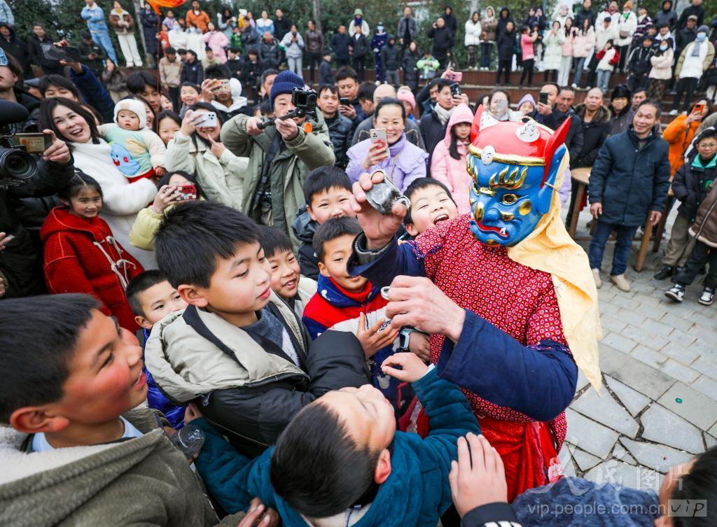 2024年2月25日,江西省抚州市南丰县三溪乡石邮村村民正在表演傩舞,吸引了全国各地的游客、摄影爱好者和附近村民前来观看。