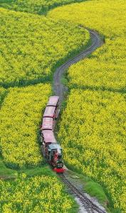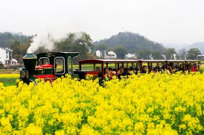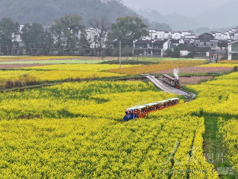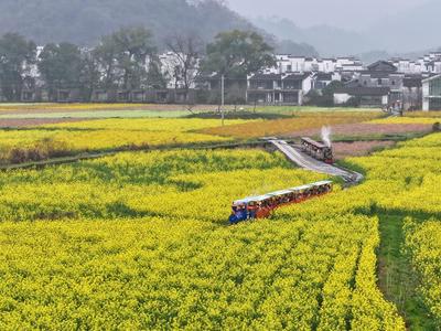 3月17日,江西省上饶市婺源县严田村,游客搭乘小火车欣赏田园春色,沿途金灿灿的油菜花与远处的徽派民居、群山交相呼应,构成一幅秀美春光图。
