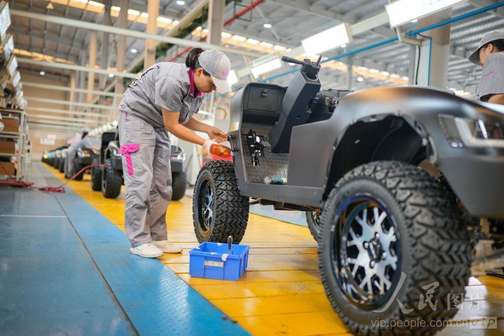 2024年3月19日,在海口国家高新区美安生态科技新城康迪电动汽车车间,工人在进行电动车的组装。 据了解,该公司具备年产10万辆各种纯电动车辆的能力,自行设计开发了具有自主知识产权的新能源汽车十余种车型,其中M系列高尔夫跨界车在美国成为爆款,产品非常畅销,同时公司正逐步开发欧洲、南美洲、东南亚等市场。