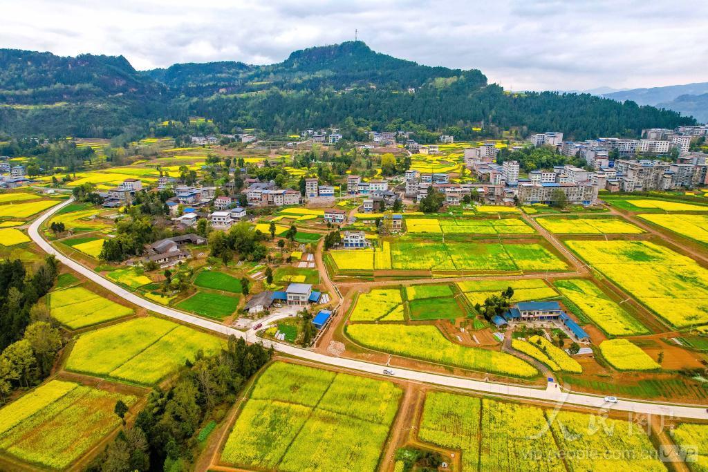 春暖花开时节,四川省巴中市通江县铁佛镇、春在镇等乡镇境内,金黄色的油菜花海与田野、道路、河流、青山等相互映衬,构成了一幅和美乡村生态宜居的画卷。