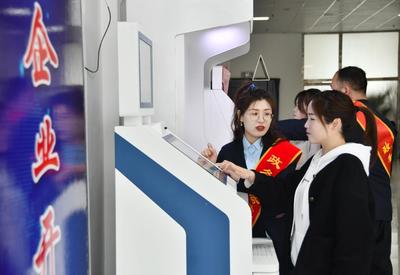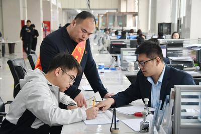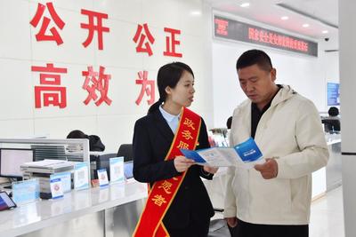 2024年3月25日,在河北省邯郸市永年区政务服务中心,党员志愿者(中)正在陪同居民办理企业变更业务。