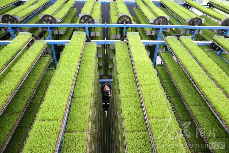 2024年3月27日,在四川省眉山市彭山区公义镇欣荣村的数智水稻育秧中心,农技人员正在查看循环式智能育秧机上的早稻秧苗生长情况。近年来,四川省眉山市彭山区在水稻生产中大力推广数智化育秧,实现水稻生产全程机械化,促进水稻增产增收。