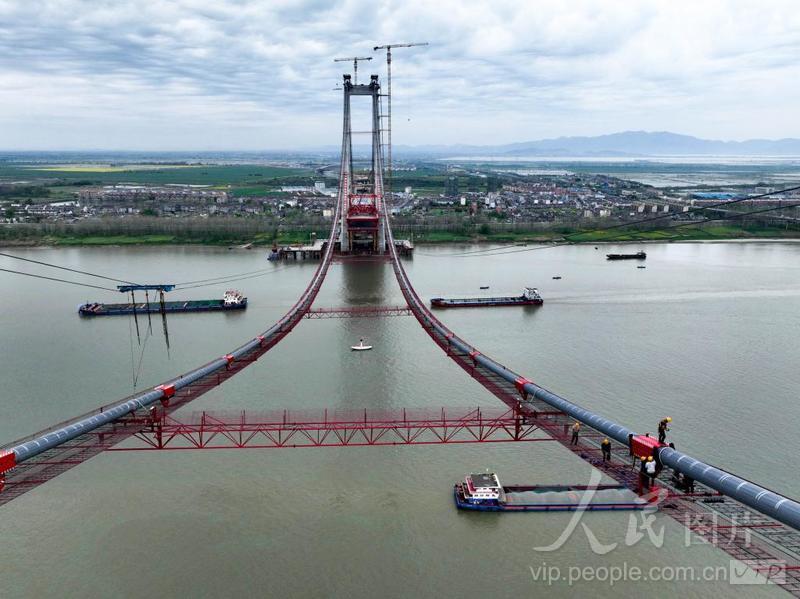 2024年4月1日,中铁大桥局施工人员在G3(京台高速)铜陵长江公铁大桥建设现场安装悬索索夹。