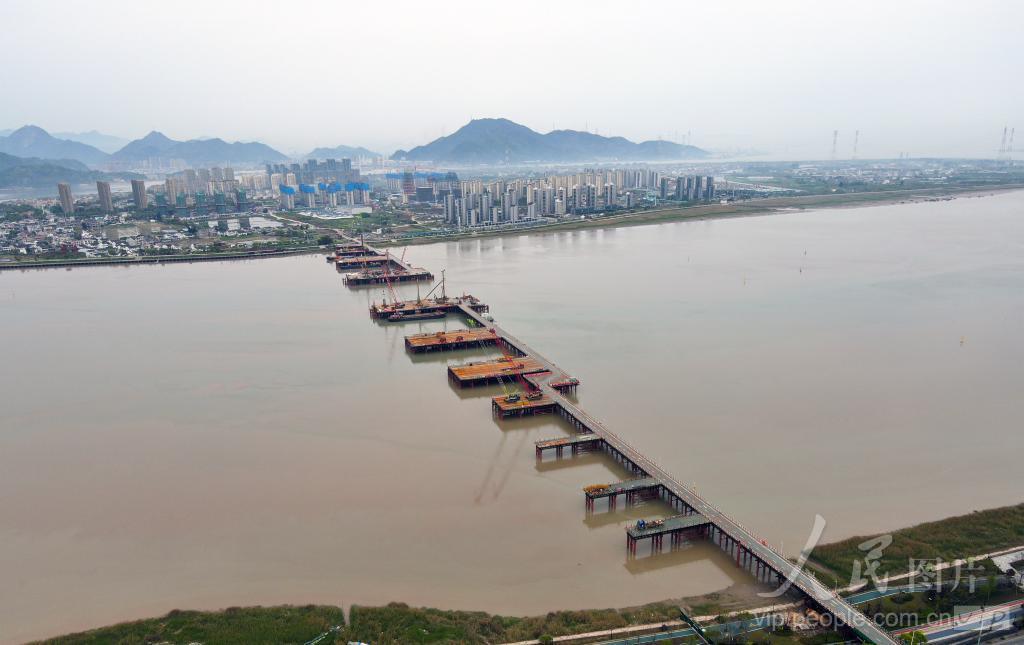 2024年4月3日,瓯江上正在进行主桥桩基施工的七都二桥(无人机航拍)。