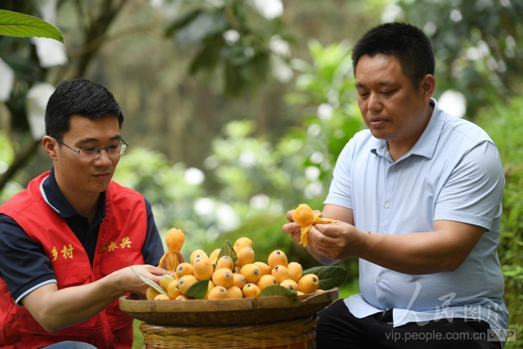 4月3日,在广西桂林市龙胜各族自治县泗水乡龙甸村,果农和驻村工作队员在品尝刚采摘的枇杷。