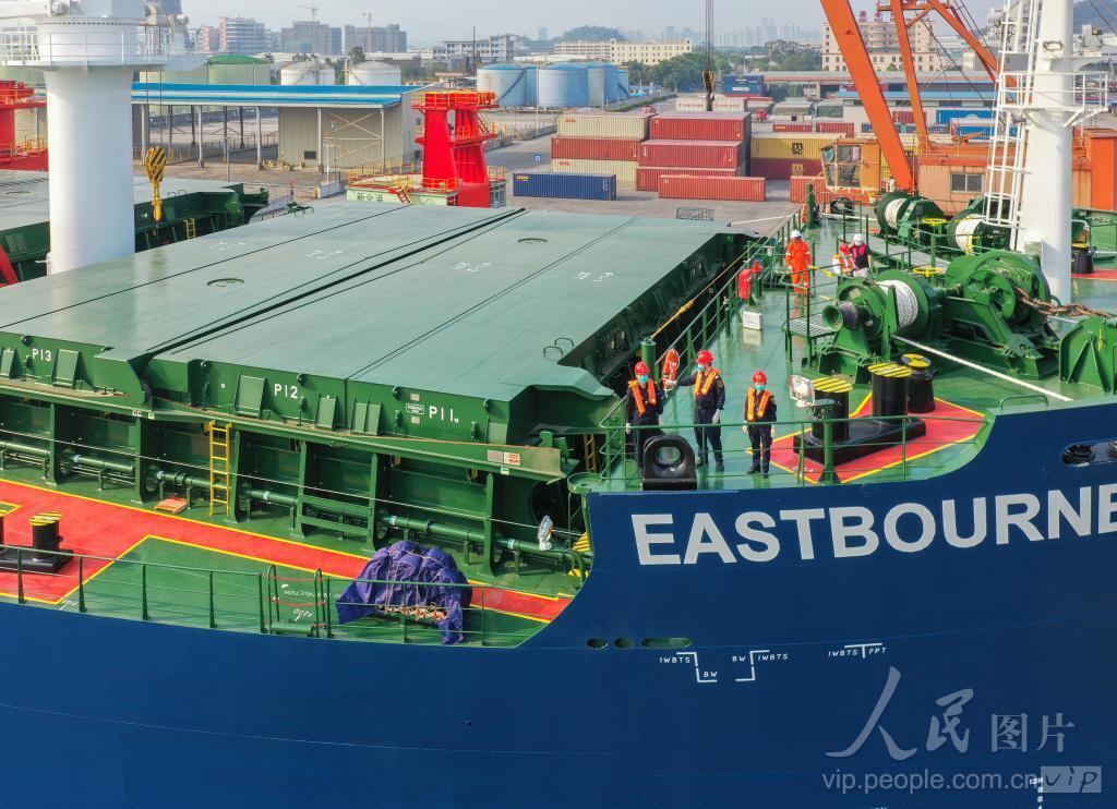 2024年4月2日,广东江门新会港一艘25150吨新建散货船正在向海关办理出口申报手续,交付给利比里亚贸易商。海关关员正在实施出口货物监管。