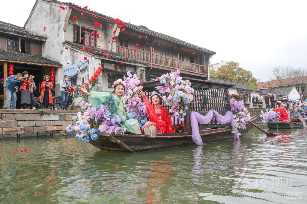 2024年4月3日,浙江省湖州市德清县新市古镇举办“清明轧蚕花”民俗活动,“蚕花娘娘”向当地蚕农抛撒蚕花,祈盼蚕桑丰收。