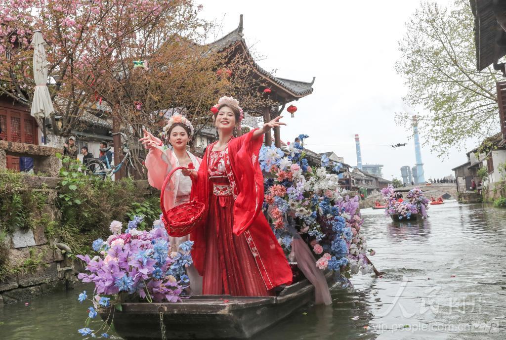 2024年4月3日,浙江省湖州市德清县新市古镇举办“清明轧蚕花”民俗活动,“蚕花娘娘”向当地蚕农抛撒蚕花,祈盼蚕桑丰收。