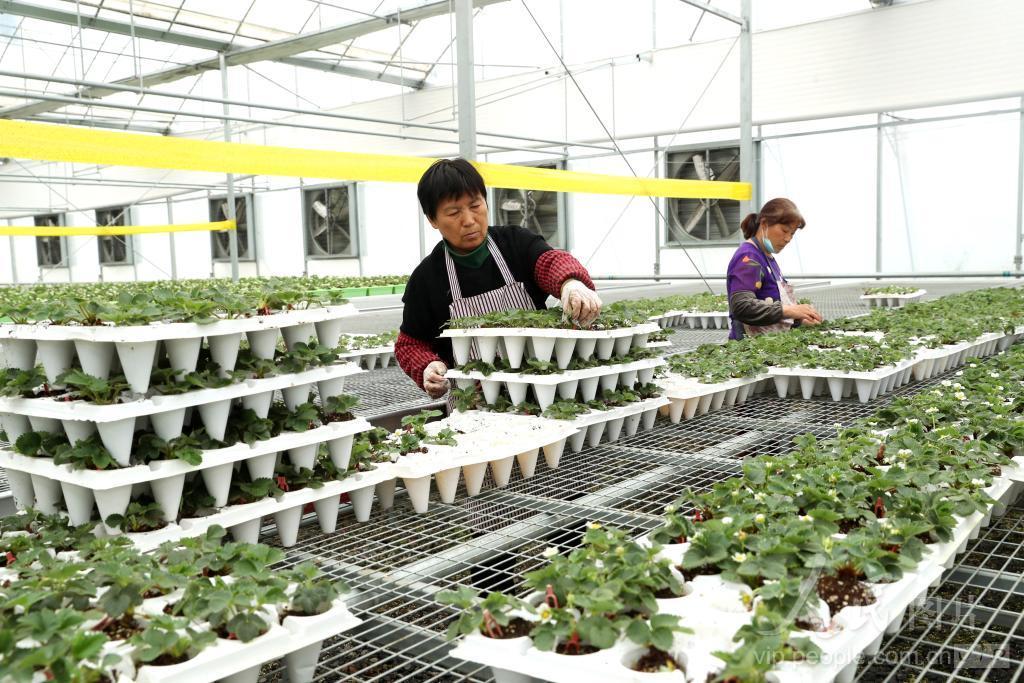 2024年4月3日,安徽省亳州市蒙城县兴农绿港数字农业工厂育苗基地,工人们正在对培育的草莓秧苗进行选苗,准备供应给“订单”企业。