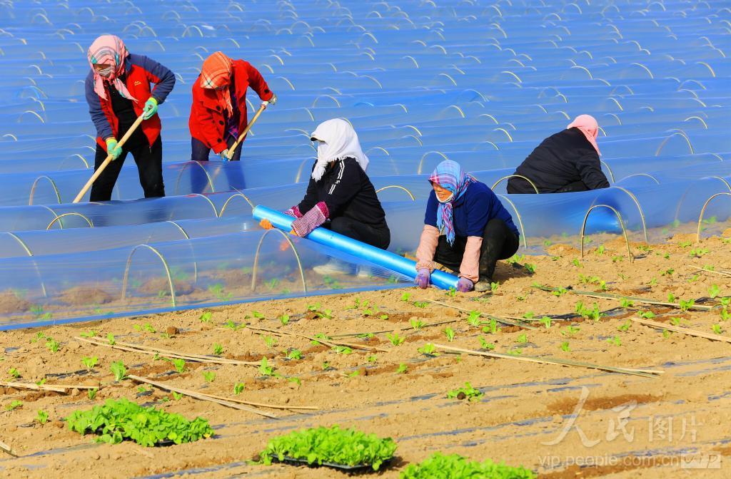 2024年4月4日,在甘肃省张掖市甘州区上秦镇下秦村蔬菜基地,村民正抓紧栽种白菜苗,搭建棚膜保温。
