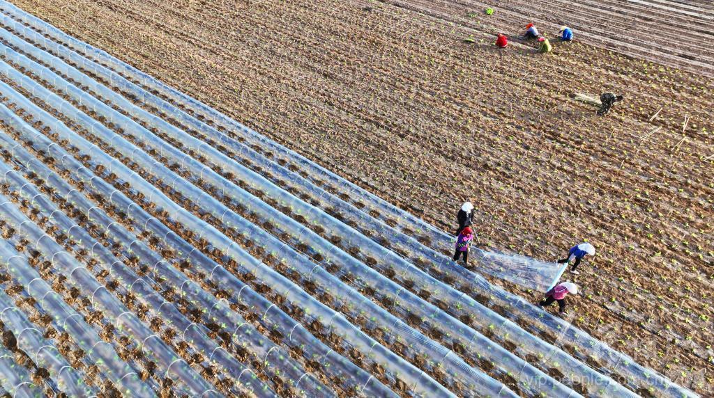2024年4月4日,在甘肃省张掖市甘州区上秦镇下秦村蔬菜基地,村民正抓紧栽种白菜苗,搭建棚膜保温。