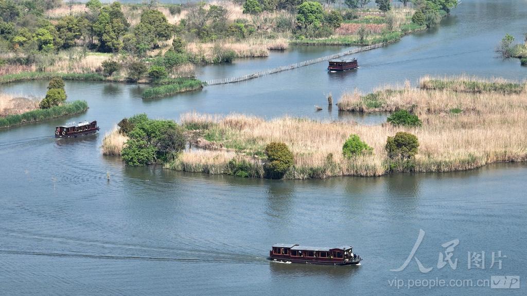 2024年4月5日,游船行驶在浙江省湖州市德清县下渚湖湿地水域。