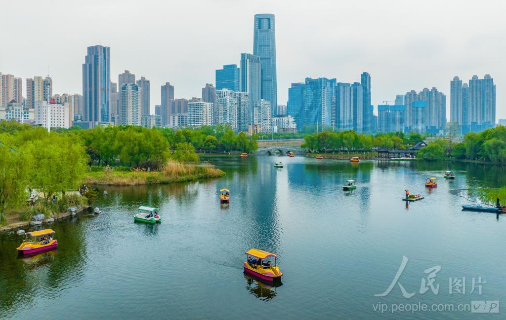 2024年4月6日,市民游客在湖北省武汉市沙湖湿地公园乘船游玩。