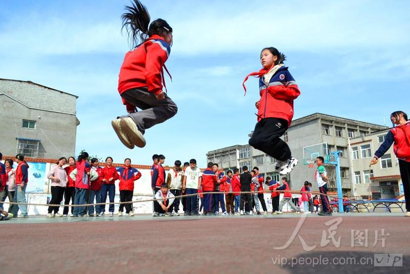 2024年4月9日,湖北省十堰市郧阳区柳陂镇中心小学“大课间”,小学生在进行“趣味体育”锻炼。