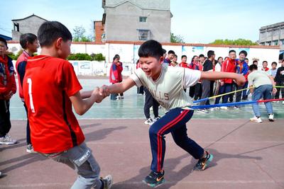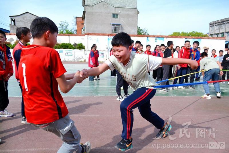 2024年4月9日,湖北省十堰市郧阳区柳陂镇中心小学“大课间”,小学生在进行“趣味体育”锻炼。