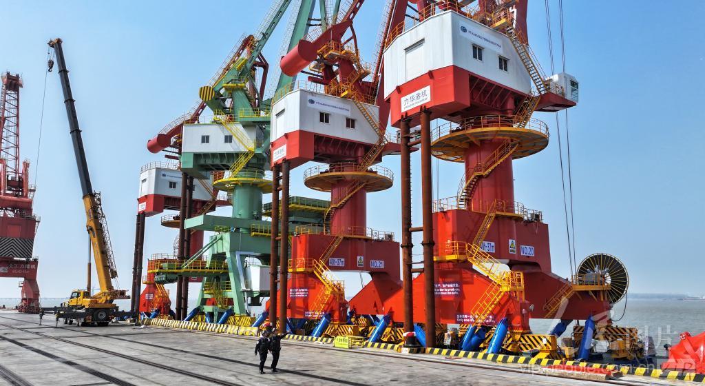 2024年4月10日,在江苏省张家港港新重装码头港务有限公司,工人们正在装运国产门座式起重机,出口“一带一路”国家。