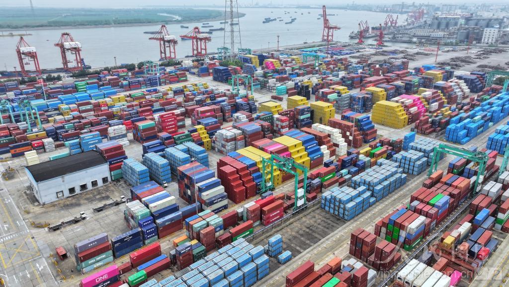 2024年4月11日,在江苏张家港港集装箱码头,车辆往来穿梭,货物装卸繁忙有序。