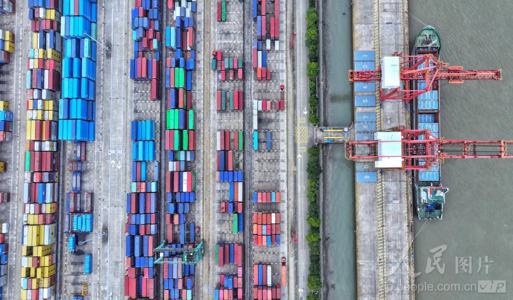 2024年4月11日,在江苏张家港港集装箱码头,车辆往来穿梭,货物装卸繁忙有序。