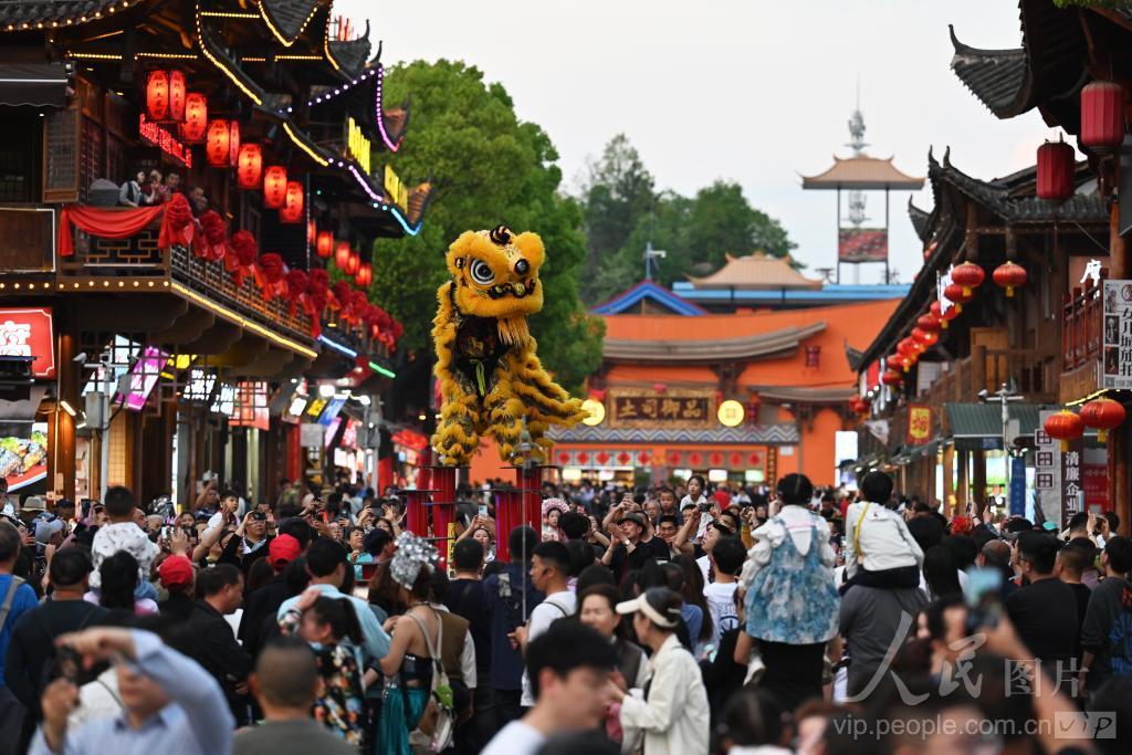 2024年4月13日,游客恩施市土家女儿城观看土家非遗舞狮表演。