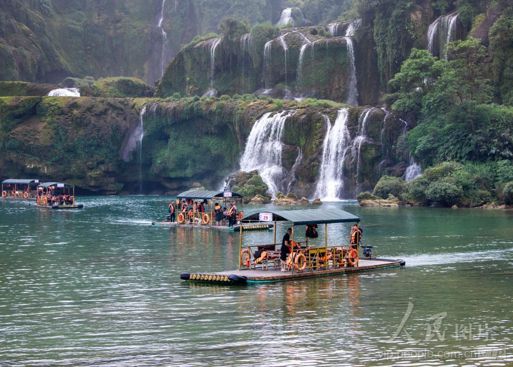 2024年4月15日,广西崇左市大新县,游人乘坐竹筏在德天跨国瀑布景区游玩,饱览沿岸秀美风光。 德天瀑布位于广西壮族自治区崇左市大新县硕龙镇德天村,中国与越南边境处的归春河上游。瀑布气势磅礴、蔚为壮观,与紧邻的越南板约瀑布相连,是亚洲第一、世界第四大跨国瀑布。
