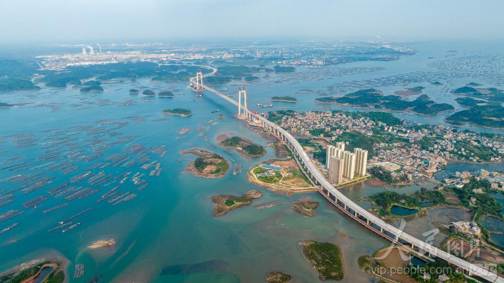 2024年4月17日,正在建设中的广西钦州龙门大桥。龙门大桥项目路线全长7.637公里,其中桥梁总长6597米,主航道桥采用主跨1098米单跨吊全漂浮体系钢箱梁悬索桥,可满足2万吨级邮轮通航要求。大桥建成通车后,将防城港与钦州港的行车时间由原来的1.5小时缩短至25分钟左右。