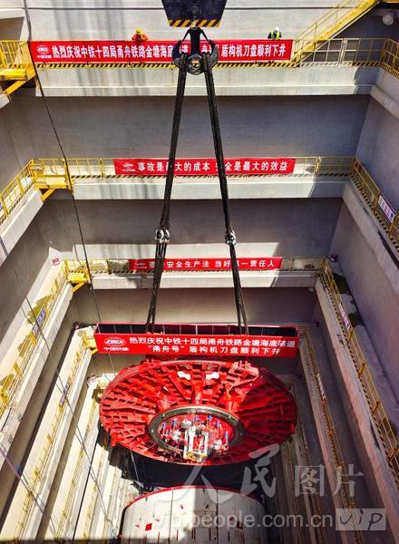2024年4月18日,起重机将“甬舟号”盾构机刀盘从地面吊运至甬舟铁路金塘海底隧道宁波侧盾构始发井。
