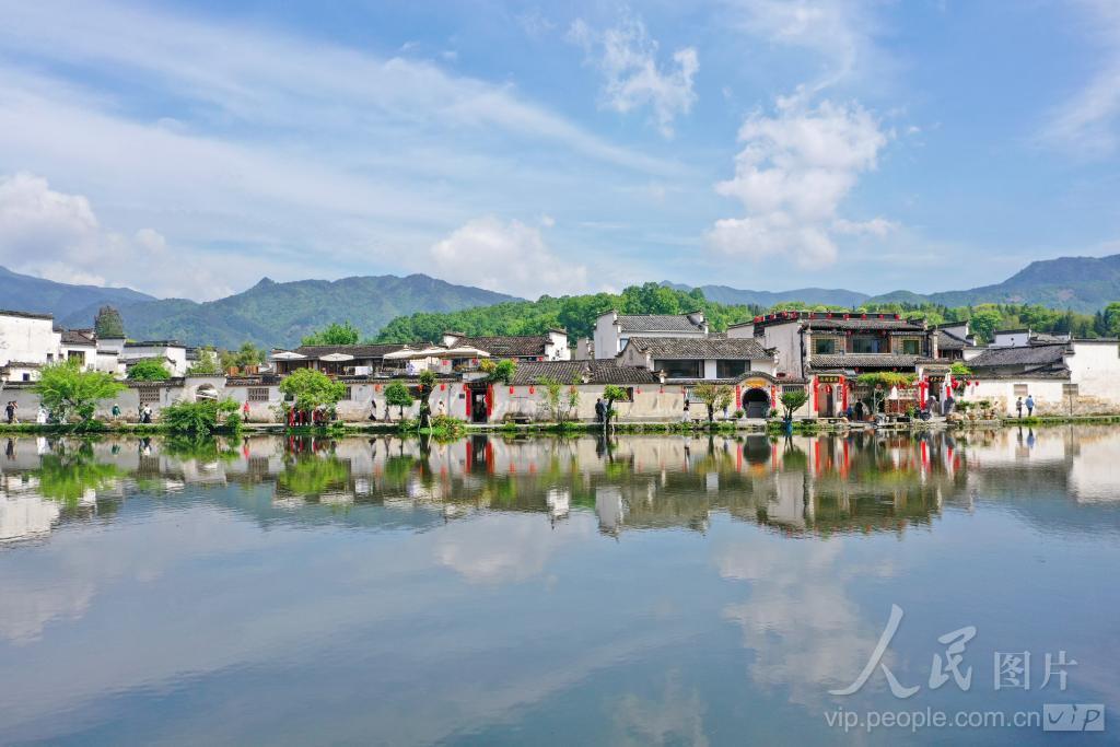 2024年4月23日,安徽省黄山市黟县宏村景色迷人,蓝天、白云与徽州古民居相映成趣,吸引不少游人前来赏景、游玩。