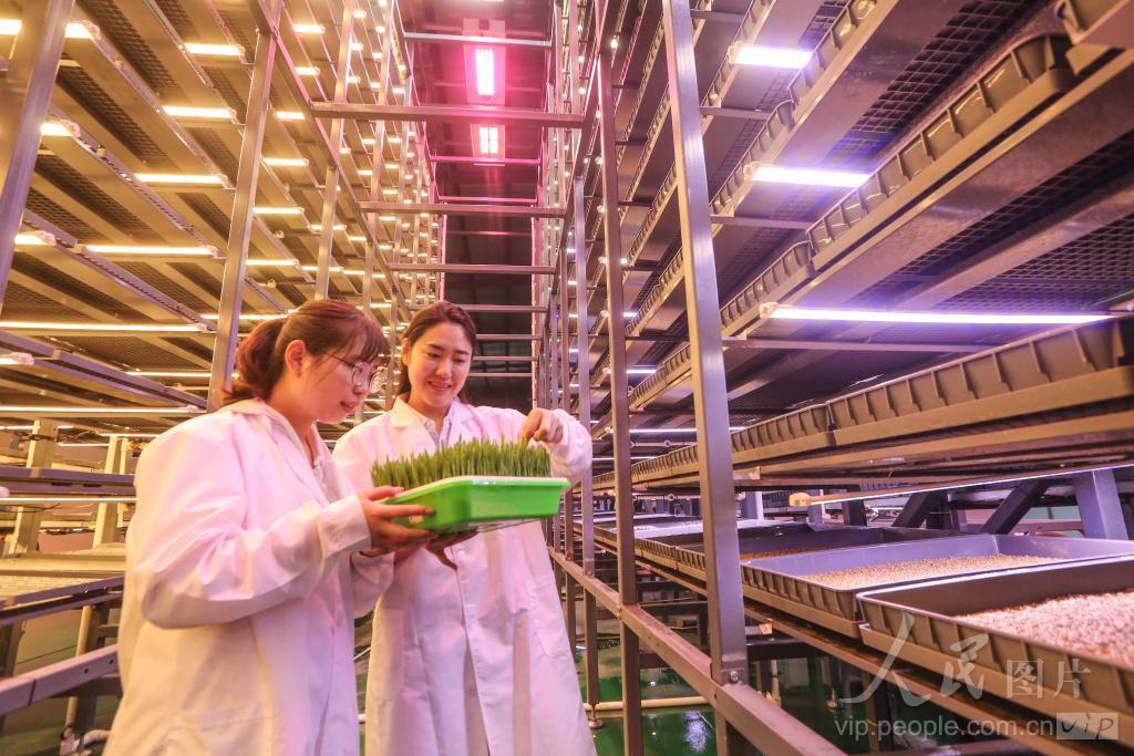 2024年4月23日,在安徽马鞍山经开区金晟达生物电子科技有限公司的“七天牧场项目”基地,员工们在查看运用新研发的生物补光技术促成种子在7日内长成植物的长势情况。