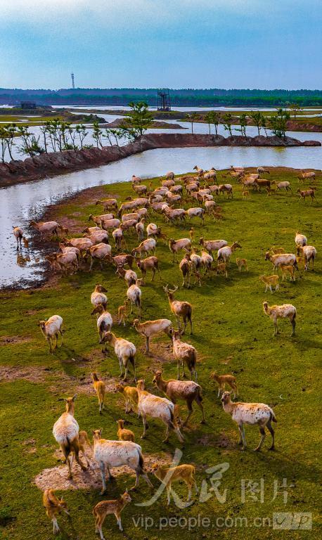 2024年5月3日,江苏省盐城市大丰区黄海湿地野鹿荡,成群麋鹿嬉戏、觅食,成为一道独特风景线。 近年来,大丰区持续开展湿地修复与保护,生物多样性越发丰富,麋鹿数量和种群数也在逐年增加。
