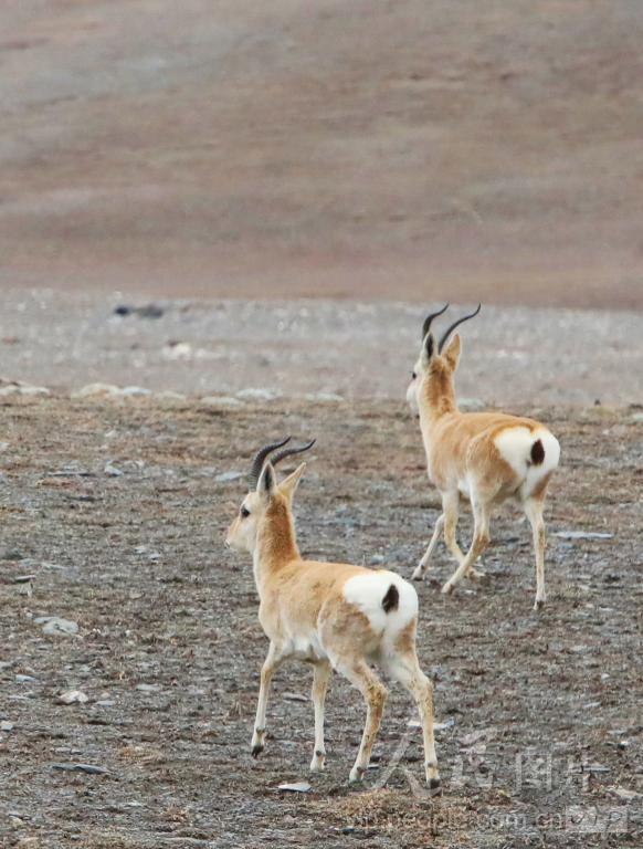 5月15日,几只藏羚羊在青海玉树可可西里的草原上游玩。